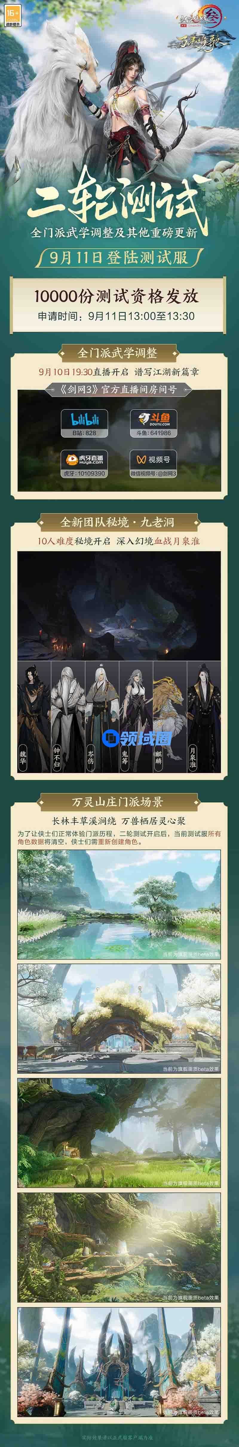 10000份测试服资格将于9月11日13:00至13:30正式开放申请,更多细节和惊喜,期待侠士们探索发现!此外,全门派武学调整将于9月10日19:30全网直播,本轮武学调整内容并不代表最终正式服数值,具体调整条目将于直播结束后在官网公告和微博放出,敬请关注!