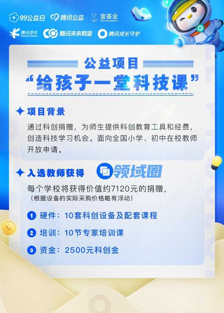 值得关注的是,今年的腾讯游戏99公益日期间,腾讯成长守护、腾讯游戏、腾讯超核玩家、壹基金,还发起了“给孩子一堂科技课”, 通过“智体双百”计划,号召社会关注并帮助欠发达地区的科技师生。项目一方面提供编程机器人等硬件科技设备,另一方面给乡村教师提供工程入门知识和编程启蒙等培训课程,以及用作科创的公益基金。