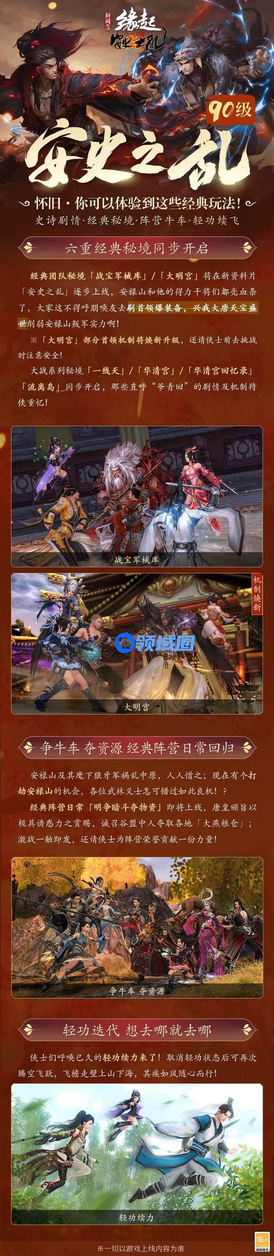 90年代乱世风云再临大唐,天宝史诗再现经典。安禄山起兵动乱,安史之乱烽烟再起,丐帮、马嵬驿及四大战乱场景开放,战火燃至都城,亟需侠士出手相助!除史诗剧情再现外,六大经典秘境也将重回江湖。团队秘境“战宝军械库”各路首领实力不容小觑;“大明宫”部分首领机制焕新,老对手藏新招;“一线天”、“华清宫”、“华清宫回忆录”、“流离岛”大战系列秘境同步开启,还请侠士前去挑战时注意安全!经典阵营日常“明争暗斗夺物资”回归武林,打劫安禄山就趁现在,众义士走过路过不要错过!此外,侠士们呼唤已久的轻功续飞也即将上线,飞檐走壁随心而行,助力侠士更好地游览大唐山河!