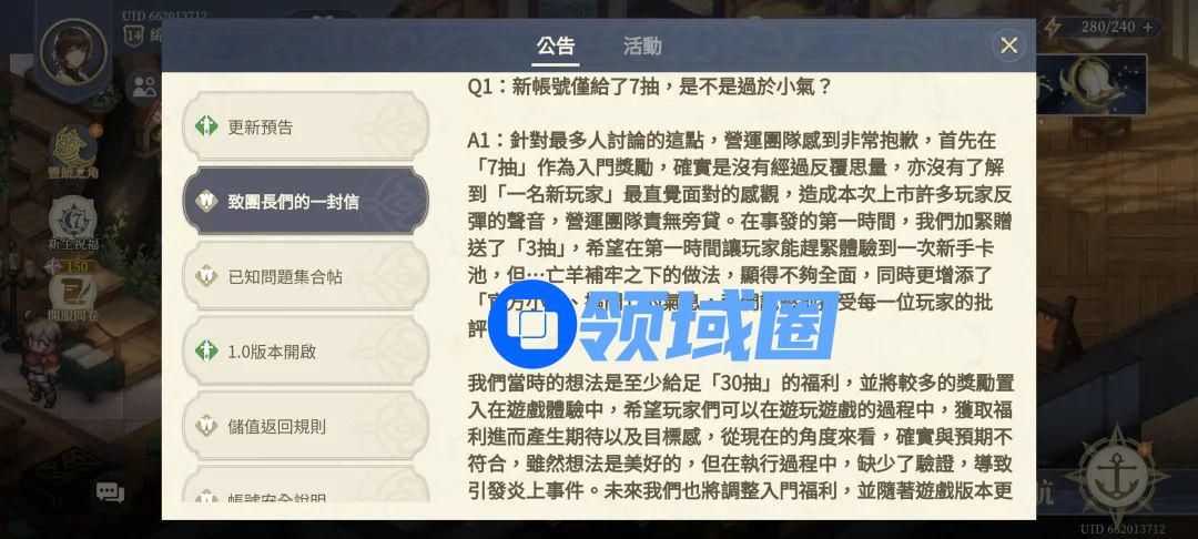 据《致团长们的一封信》中,官方已对相关问题如“新手7抽”的设计表达歉意,此前考虑不够深入,同时也对200抽保底做出了解释,并表示将赠送“秘缘”进行补偿。经过补偿后,《铃兰之剑》仅推至主线第一章末尾,玩家就可获得47抽。