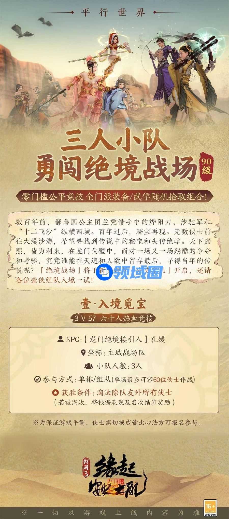 《剑网3缘起》此次龙门绝境玩法不同于以往的五人组队百人竞技,而是以三人组队60人比拼作战的方式让侠士体验节奏更快更刺激的战场。活动上线后,侠士可前往主城战场区寻找龙门绝境接引人【孔媛】参与玩法,组成3人小队加入,亦可单排等待系统分配队友。淘汰除队友外所有侠士即为获胜,若被淘汰,将根据表现及名次结算奖励。若侠士重伤后选择直接退出玩法,此时结算将以当前最后一支队伍名次进行奖励结算。为了保证游戏的平衡性,所有侠士只能切换至输出内功心法方可报名参与活动。