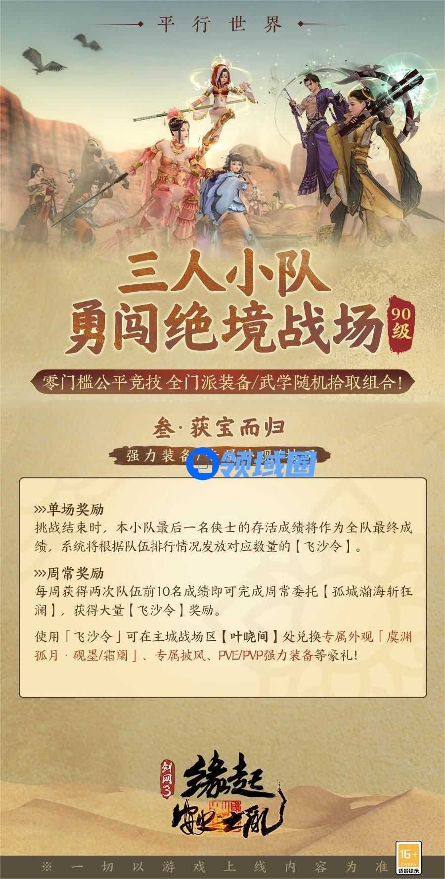 侠士们在体验新武侠吃鸡玩法时,不但能有畅快十足的武侠体验,还有海量豪礼供君选择!每场龙门绝境争霸前十名的小队将获得代币【飞沙令】,使用【飞沙令】可在【叶晓间】处兑换吃鸡专属外观、披风以及PVE/PVP强力装备等豪礼,助力侠士遨游绝境!