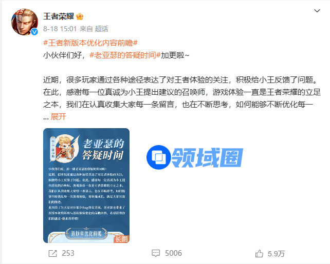 有趣的是,8年的《王者荣耀》有很多和玩家沟通、优化游戏的渠道与方式,其中这次的新版本优化内容前瞻就属于《王者荣耀》的老牌QA栏目【老亚瑟的答疑时间】,而这一期已经是【老亚瑟的答疑时间】的159期。