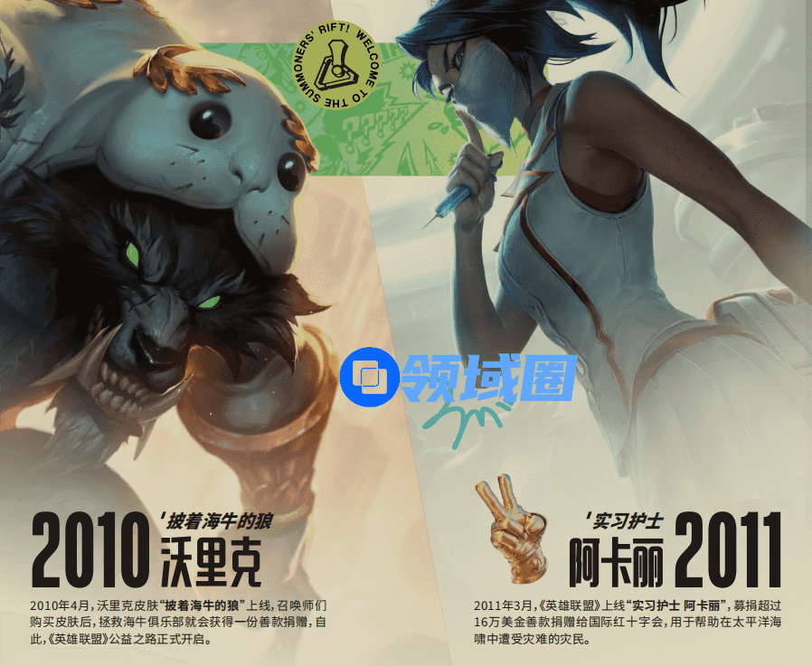 在这本英雄联盟公益手册的首页,记录着2010年发布的“披着海牛的狼 沃里克”皮肤。作为《英雄联盟》首款公益皮肤,召唤师每购买一份“披着海牛的狼 沃里克”,即意味着向拯救海牛俱乐部(Save the Manatee Club)捐赠一笔善款,也由此标志着英雄联盟公益慈善事业正式起步。
