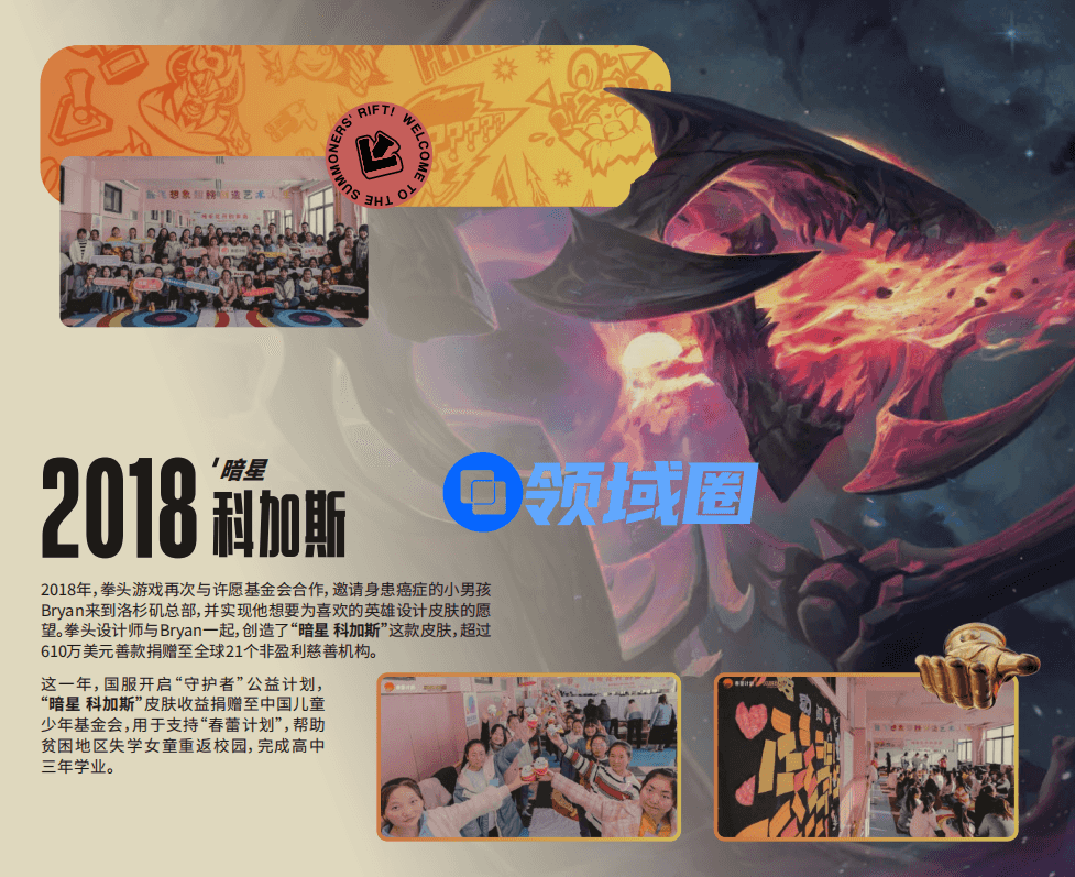 2018年,具有重要意义的“暗星 科加斯”正式上线,这款皮肤由拳头游戏设计师携手身患癌症男孩Bryan共同创作,并由后者亲自创作了一小段BGM以纪念。也是在这一年,《英雄联盟》国服开启“守护者”公益计划,携手“春蕾计划”与召唤师一起帮助失学女童重返校园。此后至今的五年时间,“守护者”公益计划不断通过推出慈善皮肤的方式,邀请召唤师们守护美好,让世界多一点温暖。