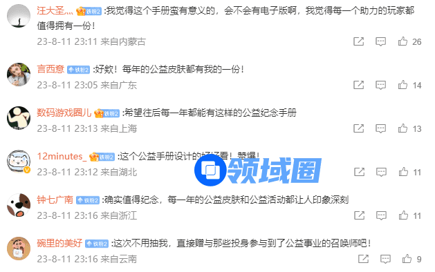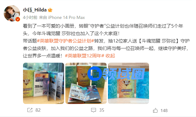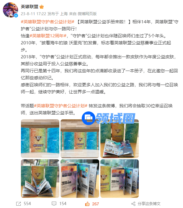 8月11日,《英雄联盟》发布公益手册,与召唤师一同回忆英雄联盟公益慈善事业和“守护者”公益计划走过的岁月。手册发布后,来自LPL的官方解说、主持人,以及各大电竞俱乐部纷纷转发分享公益故事,并送出2023年新款公益皮肤“斗魂觉醒 莎弥拉”邀请玩家一起助力公益行动。