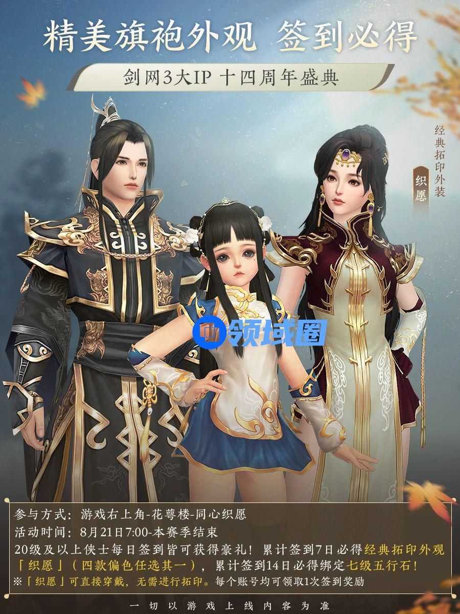 七夕巧遇周年,双喜临门好礼更多!剑网3大IP十四周年庆典8月21日上线!签到必得经典拓印外观【织愿】/七级五行石,更有可交互特效背挂【山海间】/特效称号【老江湖】相赠,闯荡江湖还可享秘境珍稀道具双倍掉率!8月28日7:00-9月4日7:00期间,各大主城、稻香村、新手镇会放置团年宴席共贺周年,首次食用必得周年烟花、趣味道具,满级侠士有概率获得不绑定珍稀奖励;每次食用还可获得增值气劲!礼邀群侠共贺大唐盛典!