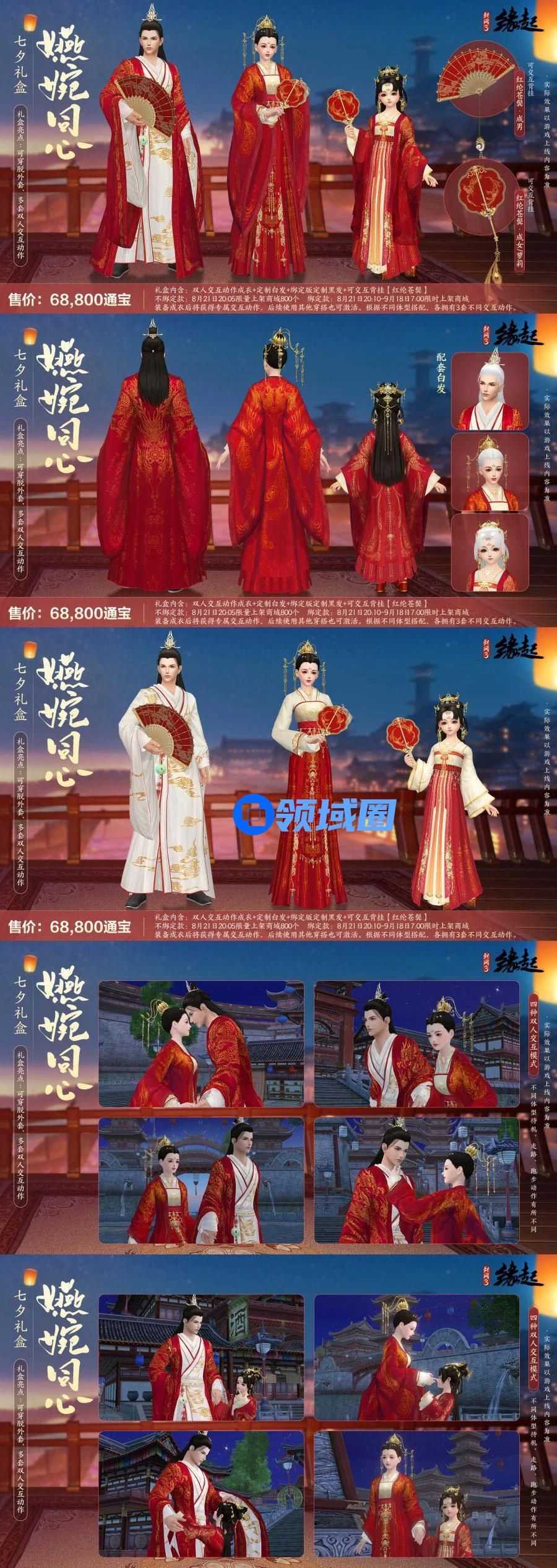 “嬿婉同心”七夕婚服主题外装礼盒上架商城,外装呈古风红色礼服,里衣外袍分体设计,龙凤金丝纹绣,尽显华贵端庄。礼盒内含特效成衣【嬿婉同心·衣】、定制黑发【嬿婉同心·黑发】、定制白发【嬿婉同心·白发】、永久可交互背部挂件【红纶苍鬓】。该外装礼盒具有三套双人交互动作,亲密互动显蜜意!