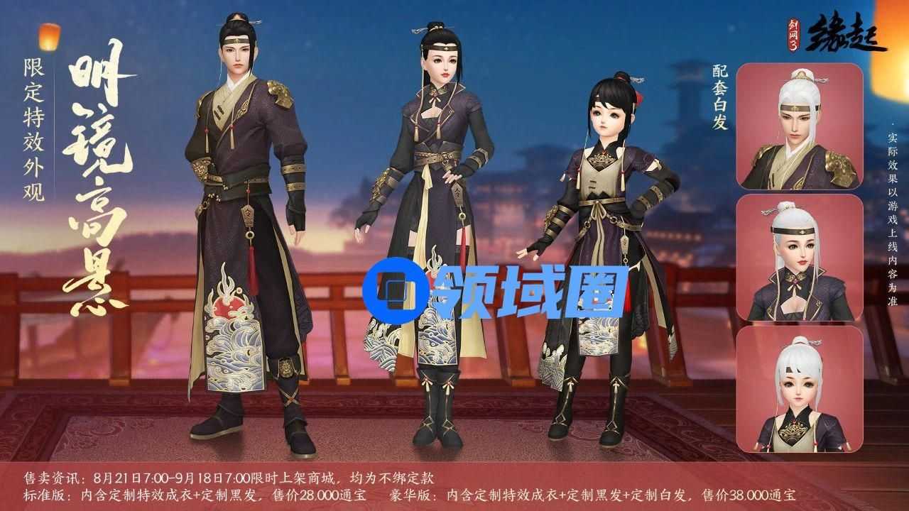 豪华版:内含对应偏色成衣【明镜高悬·衣】、黑发【明镜高悬·黑发】、白发【明镜高悬·白发】,将于8月21日7:00至9月18日7:00限时上架,售价38,000通宝,为不绑定款。
