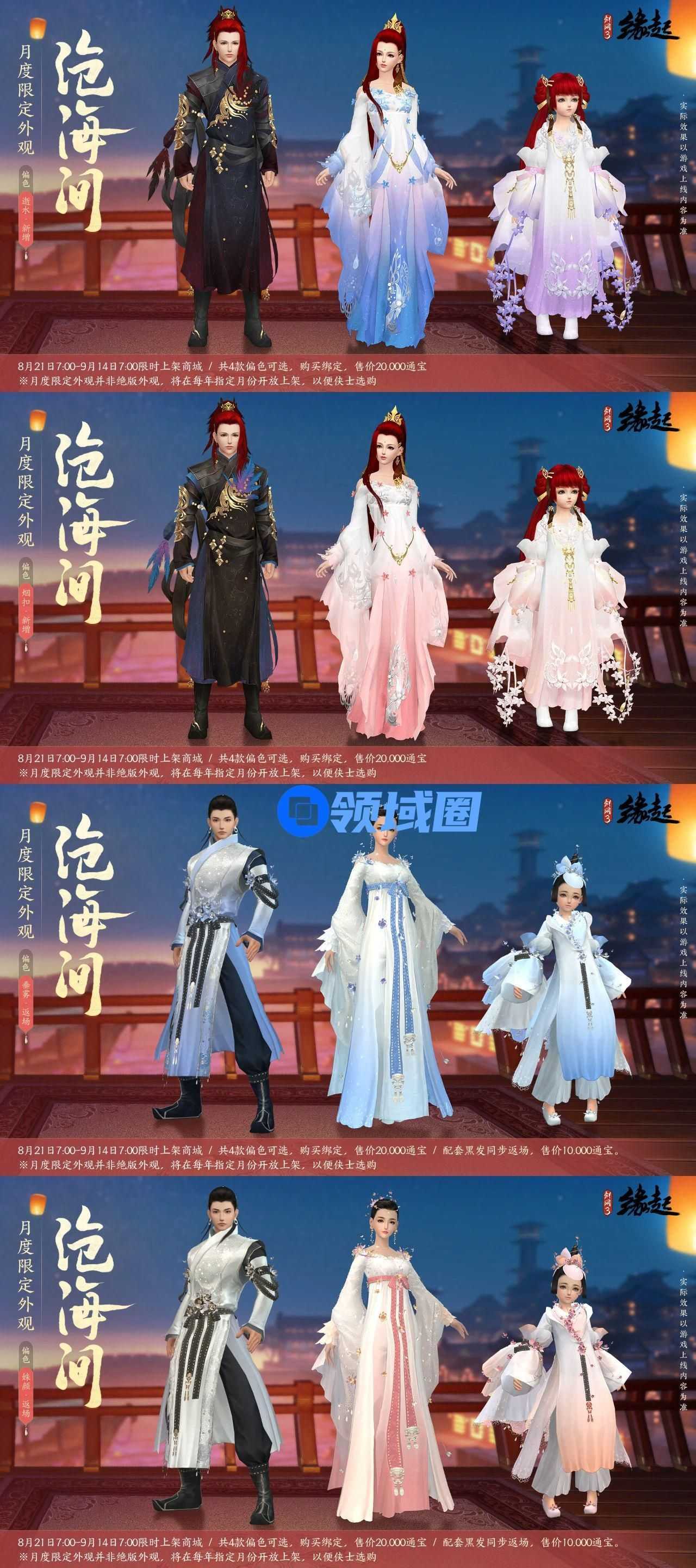 月度限定主题外装【沧海间】上架商城,新增“烟扣”、“逝水”两款偏色可选,同时“姝颜”、“垂雾”两款偏色返场,将于8月21日7:00至9月14日7:00限时上架,为绑定款,售价20,000通宝,侠士可选择心仪偏色购买。返场外装配套绑定黑发同步上架,售价10,000通宝。