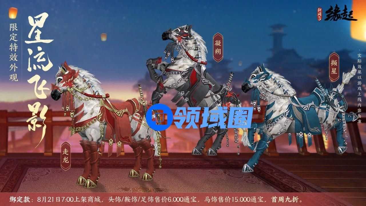 华贵马具套装“星流飞影”系列华贵马具套装将于8月21日7:00永久上架商城,马具设计别出心裁,缀以枫叶相饰,显良驹俊逸之态!共有“凝朔”、“撷星”、“走龙”三款偏色,心仪的侠士可尽快前往商城购买。头饰/鞍饰/足饰为绑定款,售价6,000通宝,首周享9折优惠。马饰为绑定款,售价15,000通宝,首周享9折优惠。