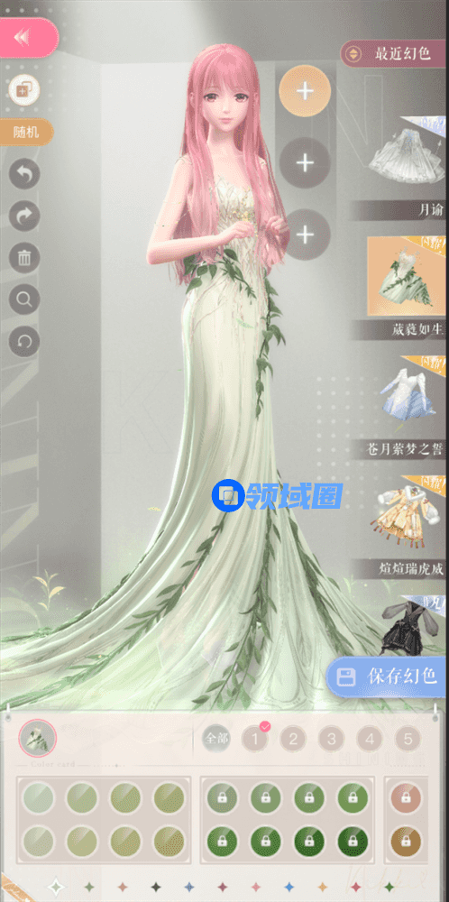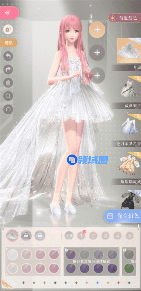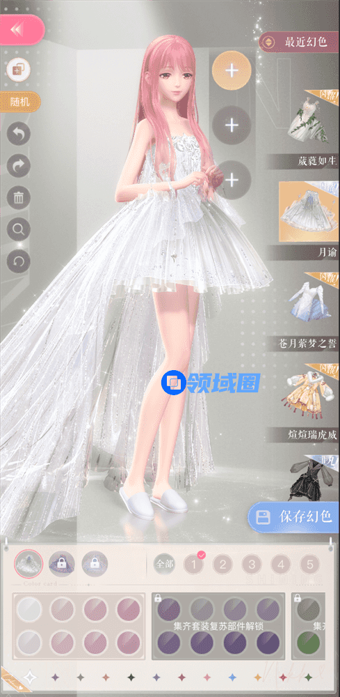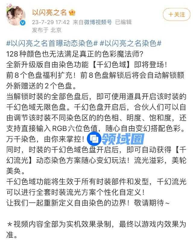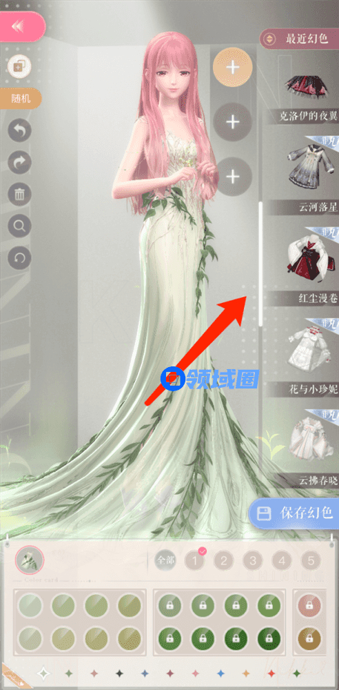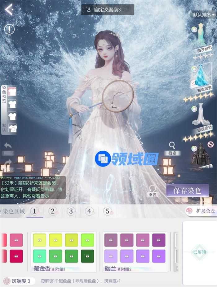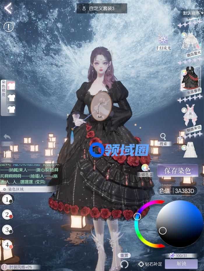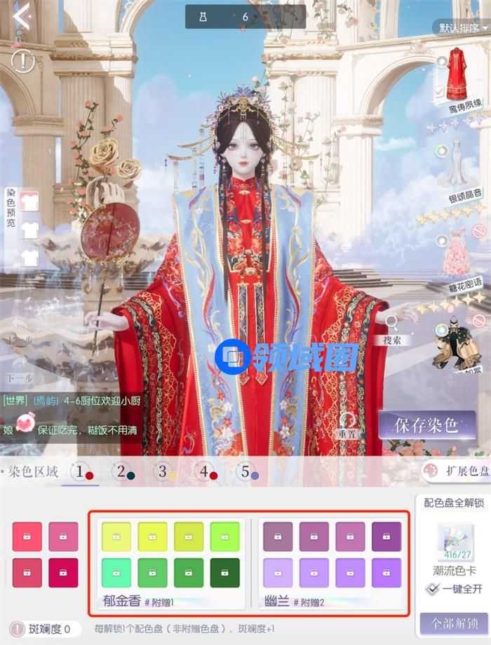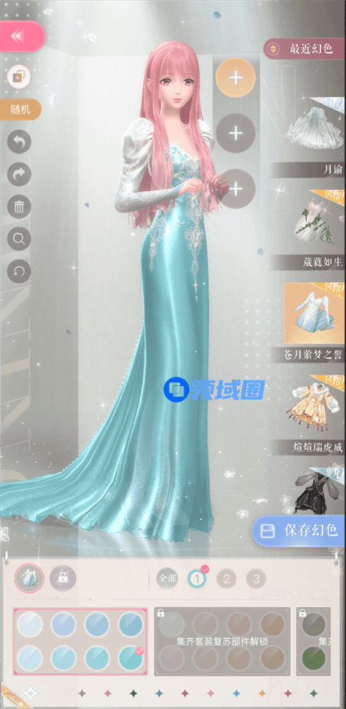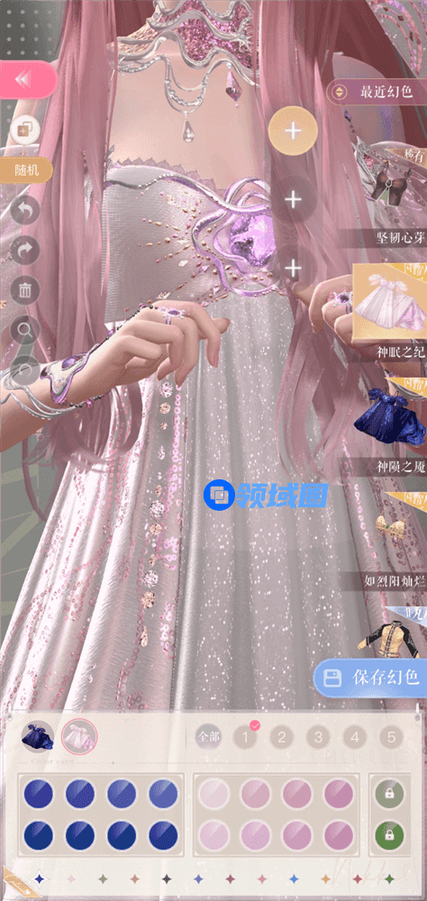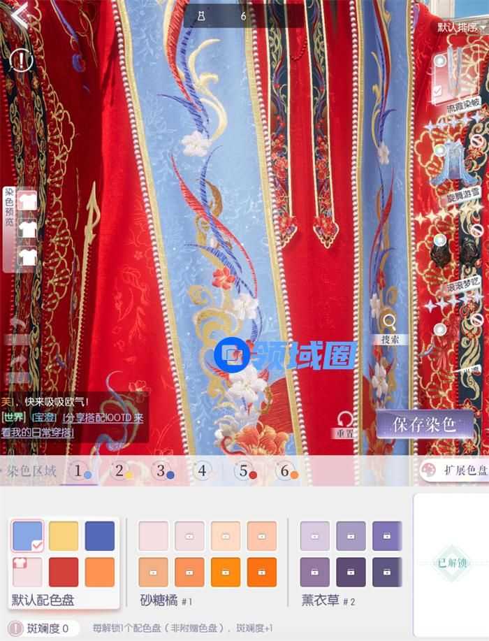 解锁后8个色盘后可升级解锁千幻色域,也就是无限色盘,玩家可以自由调节时装不同染色区域的色相、明度、饱和度,并且支持输入RGB六位色值,任意一种颜色都能调出来。值得一提的是,不论基础色盘还是千幻色域,所有等级时装和任意部件都支持。