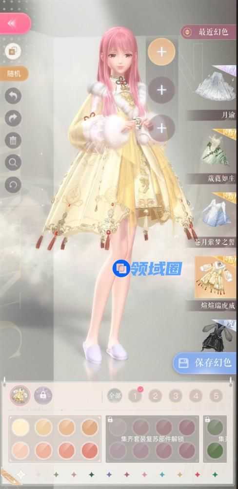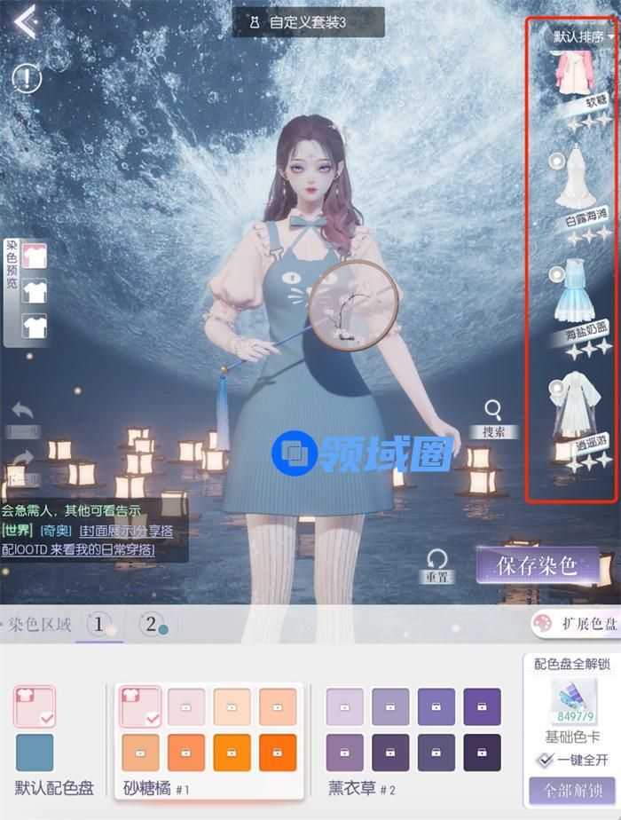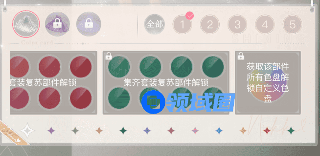 接下来是闪暖的染色门槛。获得可染色时装后,只有1个提取色色盘可用,无卡套装需在套装集齐后才能解锁10个色盘;带卡套装需在套装集齐,并对套装进行复苏后才能解锁10个色盘,全部色盘解锁后开启自定义调色。