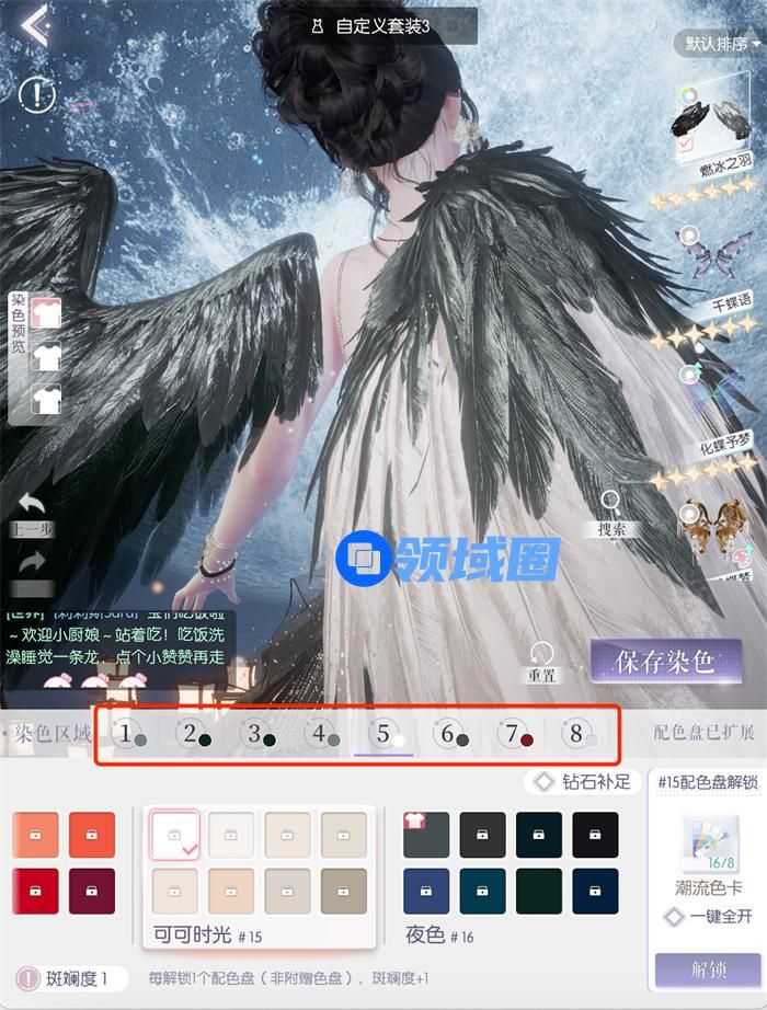 首先是染色效果。以闪根据服装、配饰不同的版型、纹样设计了不同的染色分区,以六星爱神套装为例,翅膀这个部件带有粒子特效,所以分了8个可染色区域,包含特效都能染。染色前后羽毛质感也没有变化,反而能通过染色呈现出不同的效果。