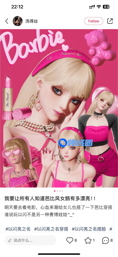 还有近期也轰炸过朋友圈的粉色风暴:《芭比》大电影,鼓舞银幕前的观众为了自己的梦想努力。而许多玩家,也在游戏中继续着芭比的粉色力量,也许从来装扮和扮演的都是别人,但却能从里面一步一步突破和寻找到真正的自我。