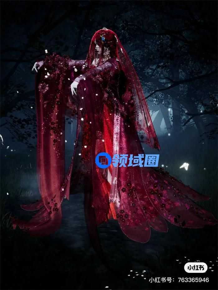 除了这次上线的时装之外,中式恐怖氛围还激起了大家创造的灵感,比如在午夜时分看到这样的场面,幽暗的森林背景搭配暗红的长裙,红色面纱更添诡异之感。