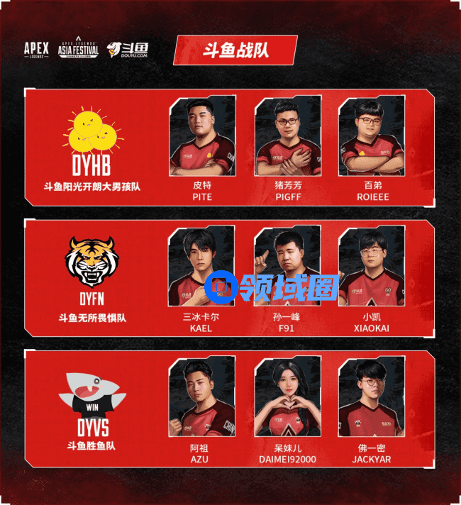 斗鱼方面,来自DreamFire战队的皮特、百弟携手FPS老牌选手PIGFF组成“阳光开朗大男孩”队,以赛事种子队伍的姿态傲视群雄;电竞谐星孙一峰则率领小凯与三冰卡尔共建“无所畏惧队”,誓要征服赛场,诠释出新时代的电竞精神;甜妹主播呆妹儿也代表斗鱼加入了战斗,联合职业选手Jackyar与阿祖Azu打造的“斗鱼胜鱼队”堪称颜值与实力并存,在正赛来临之际,他们将用属于自己的方式争夺冠军的荣耀!