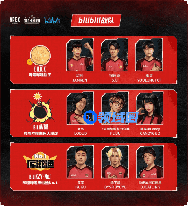 继斗鱼与虎牙之后,哔哩哔哩平台派出的选手们同样是赛事中受人关注的焦点。这些队伍中有视角姬、甜药、幽灵三位人气王所组成的“饼王队”;有渔不沮、库库、快乐滋崩三位实力选手构建的“库滋渔No.1队”;更有赛前就在各大社区中成为夺冠热门、拥有着飞狙和老吊两位天才职业选手的“白色大爆炸队”。嘉宾与选手一起搭配,实力与魅力相互交融,这些队伍中每个成员的表现,都无比值得我们的期待!