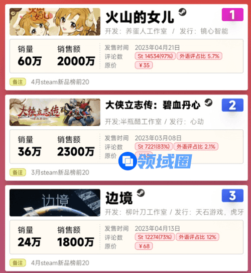 根据国游销量榜微博,去年销量冠军B站发行的《暖雪》以142万套一骑绝尘,销售额6500万;第二名《沙石镇时光》销量达50万套,销售额5500万。截止今年上半年,排名榜首的《火山的女儿》销量60万套,销售额2000万;亚军心动发行的《大侠立志传:碧血丹心》销量36万套,销售额2300万......