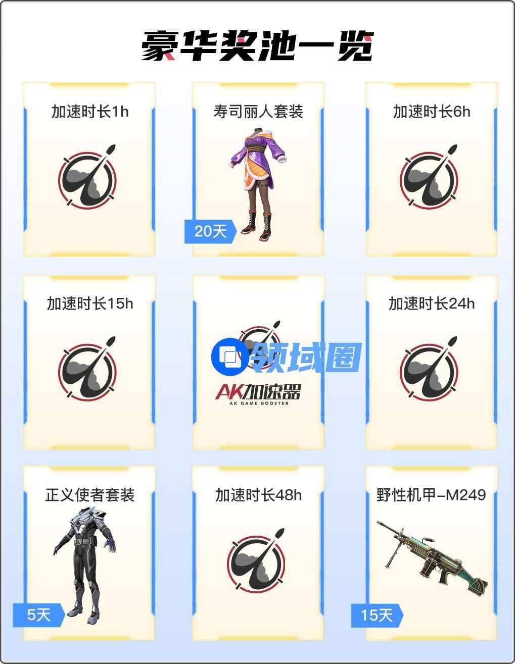 奖池非常丰富,其中包括AK加速器加速时长、PUBG M(国际服)寿司丽人套装、正义使者套装和野性机甲-M249等炫酷皮肤。每个皮肤都拥有独特的风格和属性,可为你的战斗力加持。