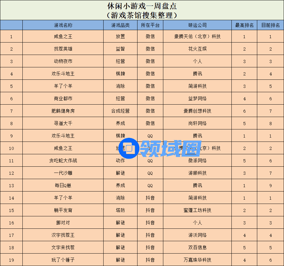 在QQ小游戏平台,来自腾讯的棋牌经典《欢乐斗地主》再次登顶魁首,豪腾天佑(北京)科技的放置小游戏《咸鱼之王》和微派网络的《贪吃蛇大作战》则紧随其后,位于热玩榜单第2和第6名。同时,游顺科技的解谜小游戏《一代沙雕》也于本周重回QQ热玩榜单前列,且其当前位于榜单第7名。