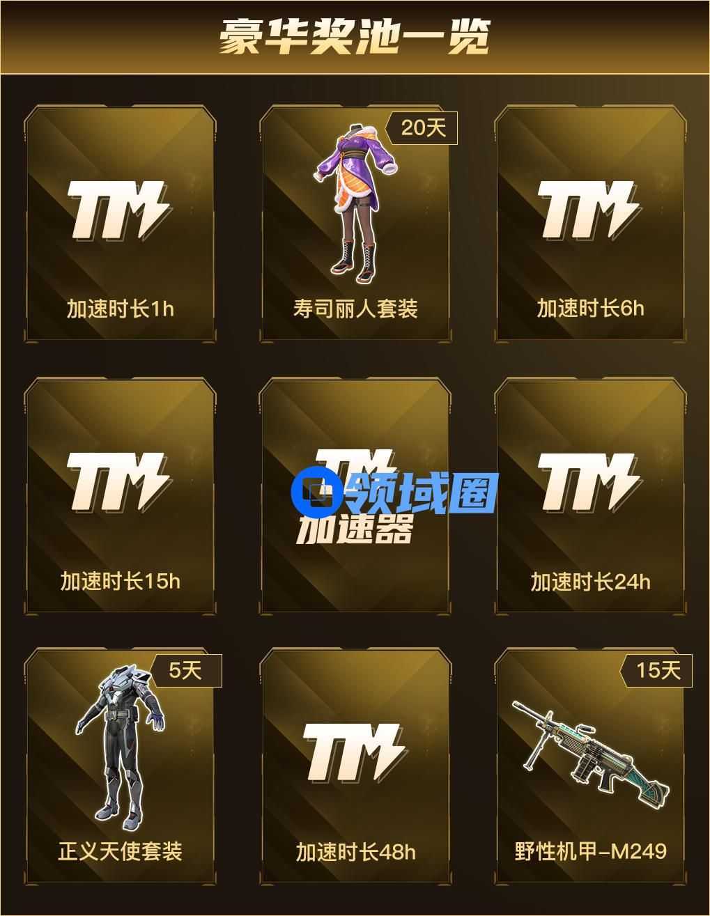 活动时间为2023年8月15日至8月30日,奖池内包含了不同的加速时长和诱人的炫酷皮肤。活动期间,玩家可通过完成指定任务获取抽奖次数后参与抽奖,100%中奖,绝无空奖。