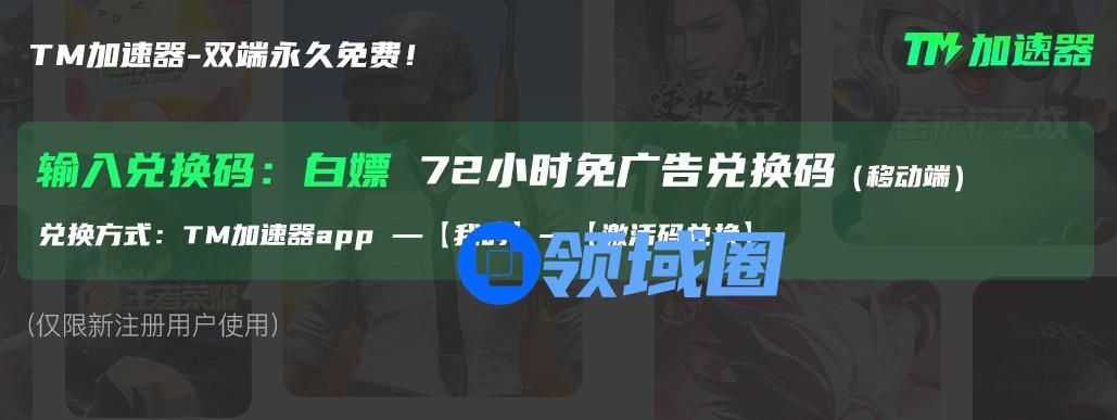 新用户使用激活码【白嫖】在TM加速器app【我的】右上角【激活码兑换】可获取1次抽奖次数和72小时免广告加速哦!