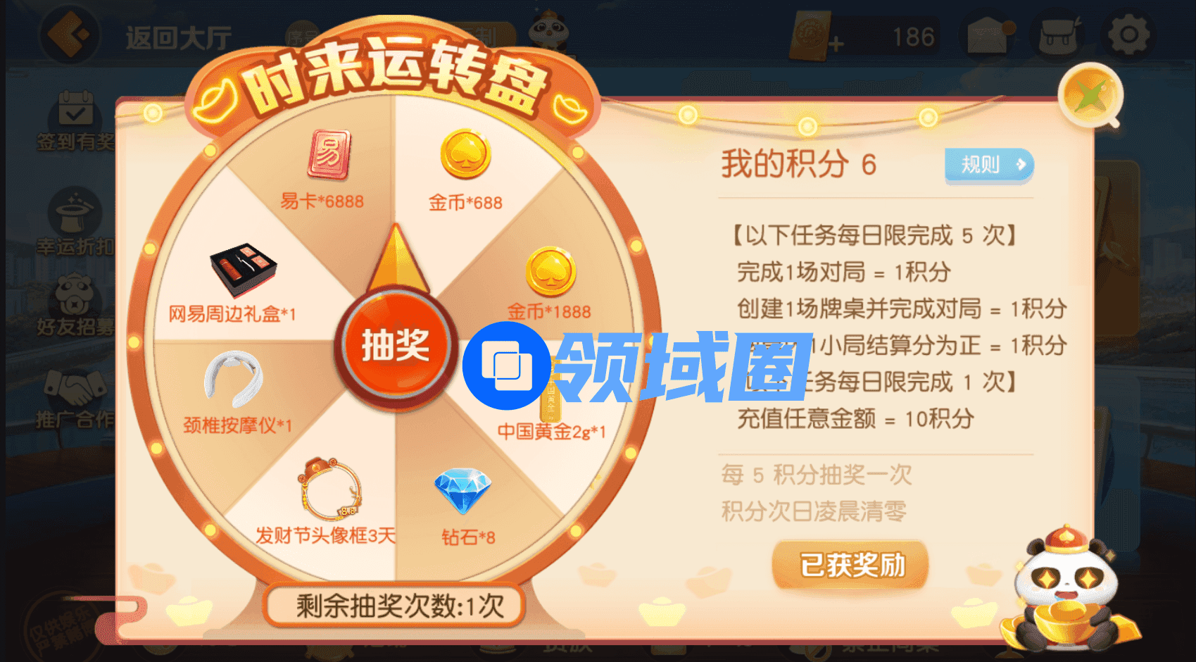 8月9日至8月16日,时来运转盘转出好运来!牌友们可前往【首页-88发财节-时来运转盘】,完成指定的约牌任务获得转盘积分,使用积分即可轻松抽取丰厚大奖!奖池里不仅有颈椎按摩仪、精美周边等丰富礼品,更有中国黄金金条2g等你带回家!丰富奖励不容错过,快前往游戏转出属于你的好运!