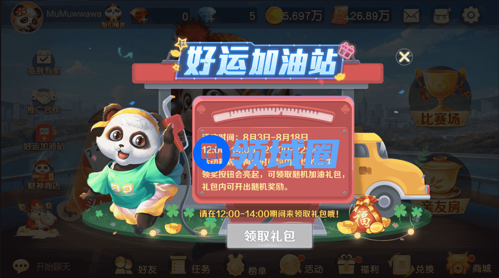 8月3日至8月18日,好运加油站福利大派送!只要在12:00-14:00、20:00-22:00两个时间段在线,即可通过【首页-88发财节-好运加油站】活动页面免费领取易卡、房卡道具等加油礼包!多种实用道具随机送出,为你的八月牌局助力无限!快前往游戏参与活动,一起乐享秋日趣时光!