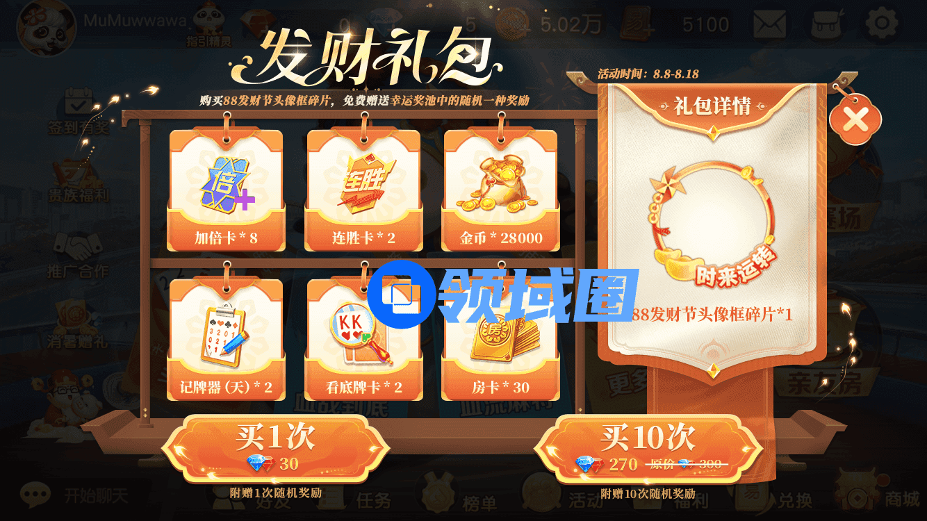 8月8日至8月18日。发财礼包送好运,丰富道具拿不停!前往【首页-88发财节-发财礼包】页面,消耗钻石购买头像框,即可免费获赠幸运奖池随机一种奖励!房卡、连胜卡、加倍卡等实用道具大放送,助力各位牌友在发财节好运连连,牌友们抓紧前往了解吧!