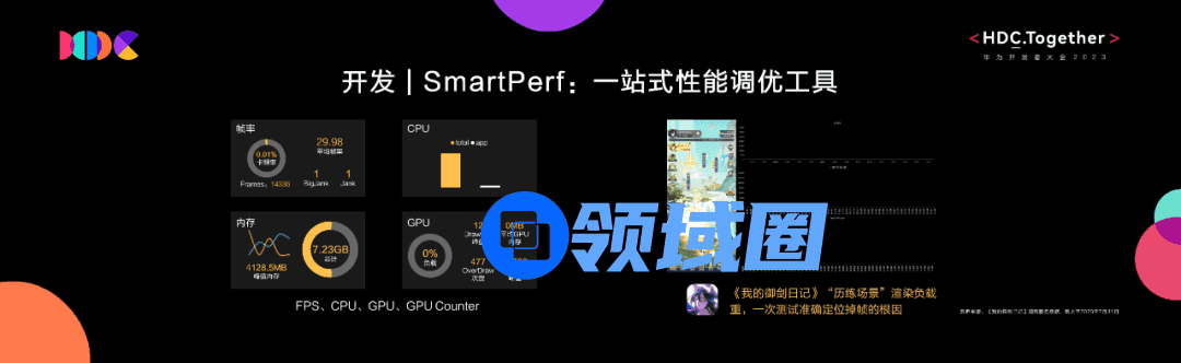 发现问题后,开发者可以通过SmartPerf一站式性能调优工具进行问题定位,该工具也是今年新推出的能力之一,通过游戏测试,一次性收集系统数据、引擎数据和游戏数据等,帮助开发者定位性能瓶颈。以《我的御剑日记》为例,游戏试玩数据显示,某款旧机型占比高,多指标评估未达预期,通过图像渲染性能分析工具对此进行专项优化,帧率提升达45.4,抖动率降低0.8,实现画质和流畅度的提升;同时在历练场景发现掉帧情况,通过SmartPerf工具发现渲染负载重,一次测试准确定位掉帧的根因,有助于快速解决性能问题。