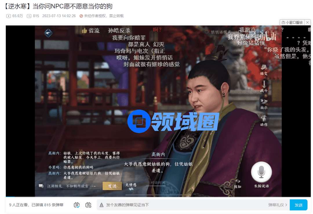 在此期间,以B站和抖音等视频平台为阵地,玩家借由游戏内容自制大量UGC内容并快速传播,比如在线“晒”老公老婆的颜值,对AI npc调教的整活视频,或是活动团本的攻略教学等。