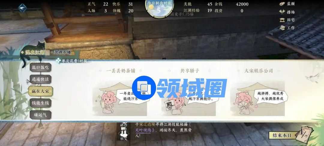 茶馆原以为这就是一个单纯的玩法复制,然而没想到进入中期之后,竟然摇身一变成为了一个模拟经营游戏。玩家需要在7日之内,自行决定如何使用掉每天的行动点,或是找份工作混口饭吃,或是撒钱如麻逍遥快活,混得不错的甚至可以置地购房,众里寻他好不快活。
