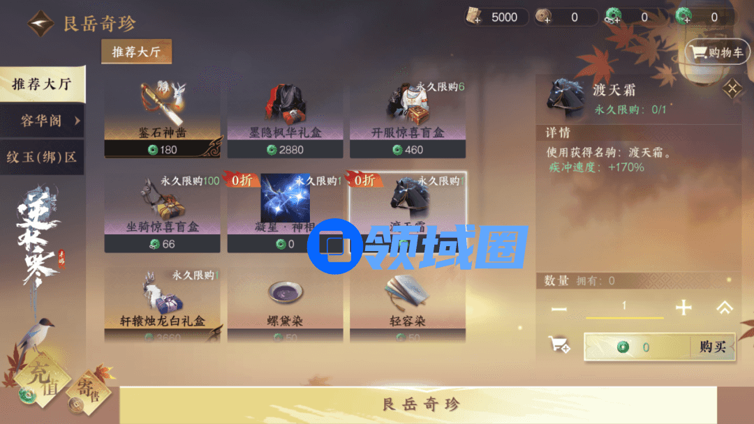 比如想要好看的坐骑,建议先去商城里逛逛,这匹叫“渡天霜”的神马,居然只卖0元;想要快速提升气质,建议考虑一下这个叆叇,好看又不贵。