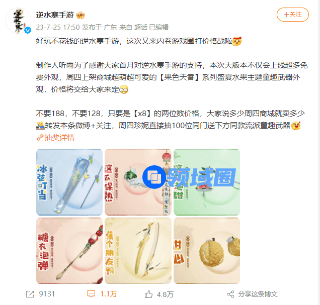 自己和自己打价格战已经不太常见,还去“卷”整个游戏圈商城定价的更是极为少见。上线首月,《逆水寒》手游就整了一个“大活”,一套即将上线的水果武器,居然让玩家来定价,官方自己选择摆烂。