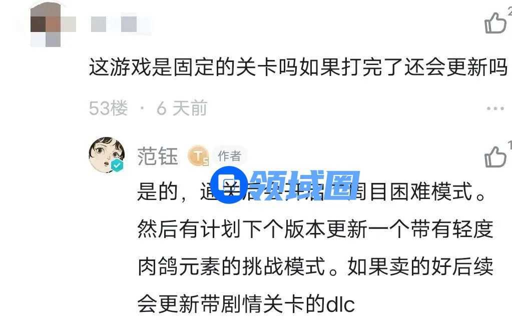 关于后续的设计改进,项目组表示,玩家除了在一周目通关后开启困难模式,后续他们还将推出带有轻度肉鸽元素的挑战模式。如果销量不错,后续还会更新带剧情关卡的DLC。