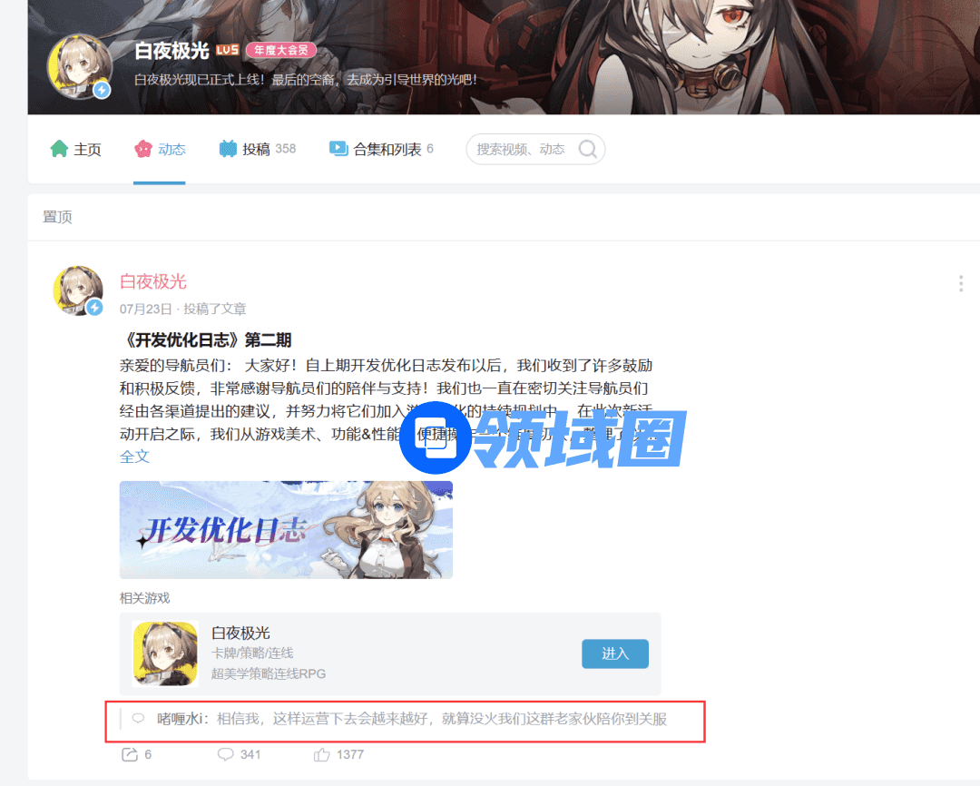 项目组:感谢支持。我们深知想要《白夜极光》走得更远必须比别人反应得更快、更果断,才能更好地去回馈我们的用户,在未来我们也希望持续贯彻这一点。