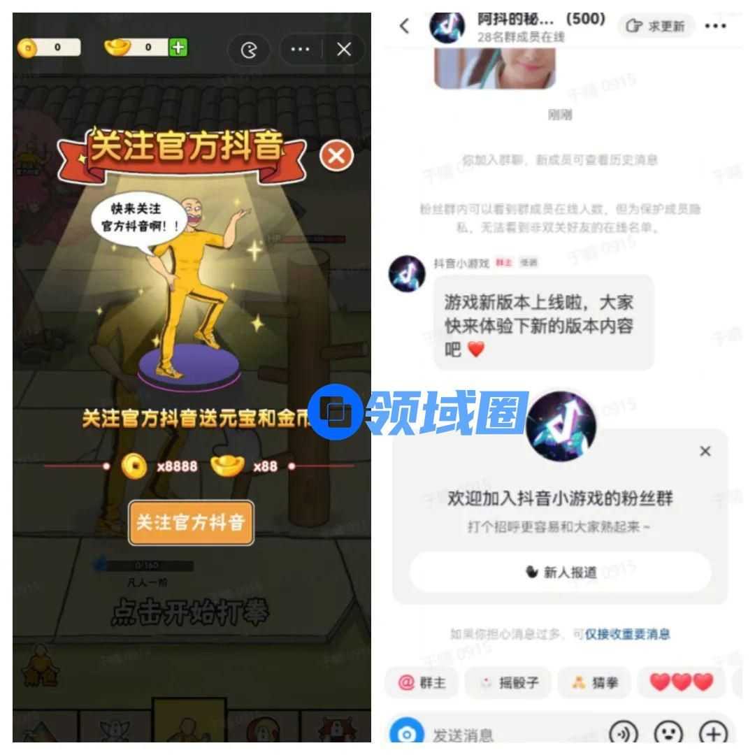 对于已经加入游戏的用户,开发者可以在游戏中合理嵌入社交分享、录屏截屏,游戏互推等功能,推动玩家实现二次裂变,也可以通过运营官方抖音账号、维护玩家社群等方式进行玩家私域经营,提升玩家粘性。