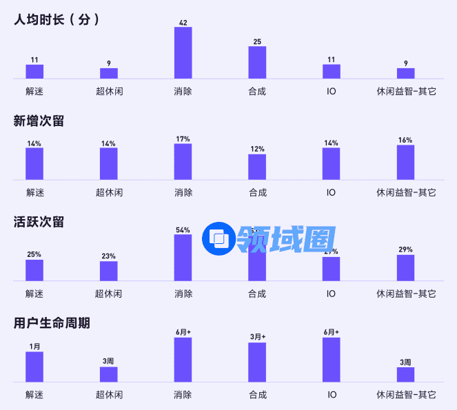 此外,抖音小游戏还在《休闲益智解决方案》中公布了一组“优秀线”数据,通过量化的方式展示出了消除、合成、解谜、IO、超休闲等细分小游戏品类的市场表现情况。具体来看,消除类小游戏最擅长留住玩家,它的人均市场、新增次留、活跃次留和用户生命周期数据都是最高的,其次是合成类和IO类。