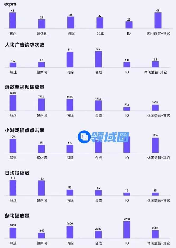 解谜类游戏的投放效果是最好的,解谜小游戏的ecpm为48,位居所有细分品类的首位。从短视频内容产出的角度来看,解谜类游戏的爆款单视频播放量也是最高的,达到了800万次,日均投稿数也以119,居于首位。尽管IO类小游戏锚点点击率和条均播放量都是最高的,但是这类游戏内容的日均投稿数量少且爆款播放量低,因此整体投放效果很难与解谜类匹敌。做IO类产品的开发者,可以通过增大内容产出量级和质量的方式,进一步提升投放的效果。