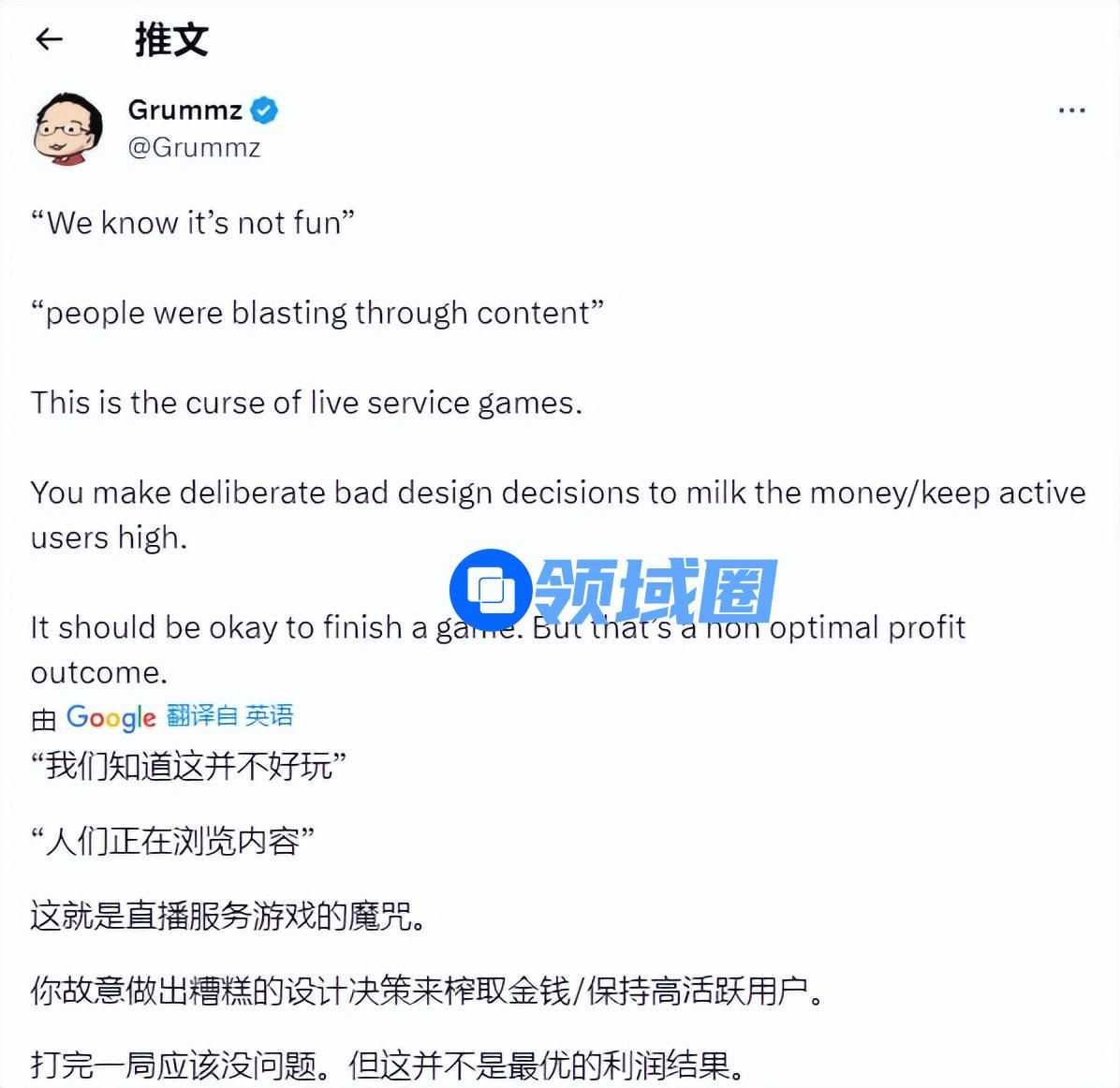 甚至连《暗黑2》的制作人Mark Kern都忍不住发推,锐评该游戏就是个半成品,“利用大量糟糕的决策迫使玩家氪金并保持高活跃度。做完一款游戏根本没有问题,但这并不是榨取最大利润的最优解。”他认为《暗黑4》就是在线游戏的牺牲品。