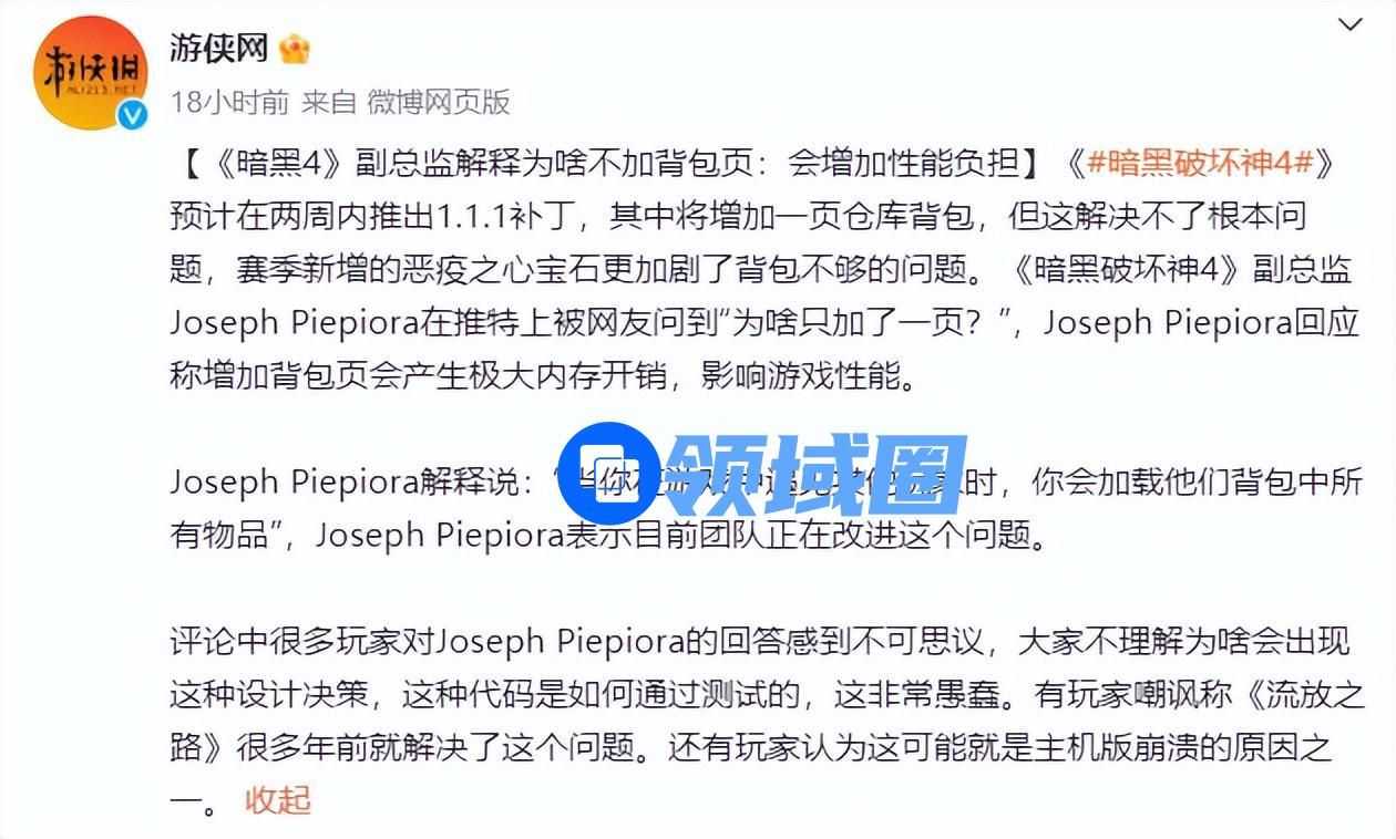 而被玩家从开服吐槽到现在的背包页数量以及宝石栏位,自从上次开发者篝火活动确认将在第一赛季前上线之外,直到现在不见任何踪影。《暗黑4》的副总监甚至亲自回应,表示增加背包页将会产生极大的内存开销,影响游戏性能。因为当遇到其他玩家的时候,将会加载他背包中的所有物品,然而立马就有玩家嘲讽好几年前的《流放之路》早就解决了这个问题。