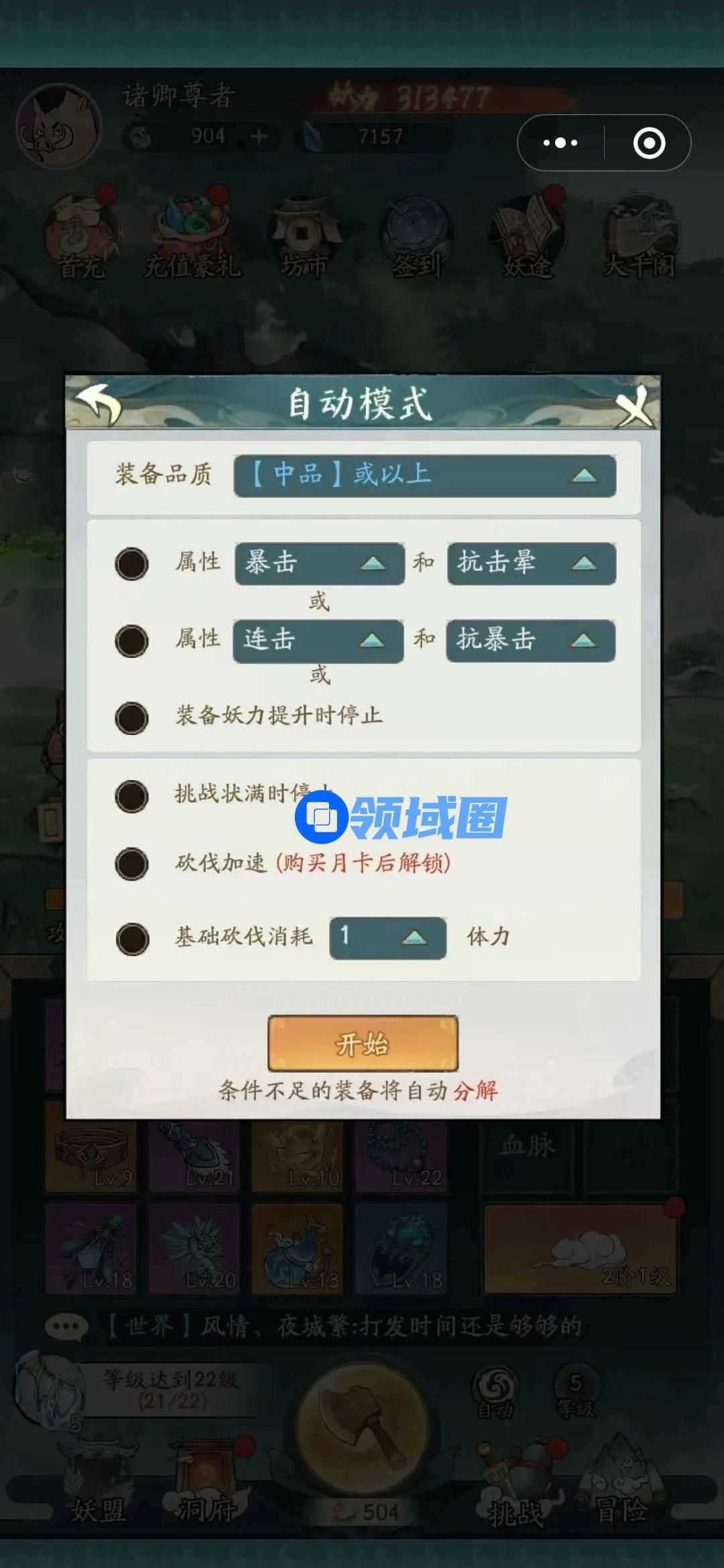 在玩法上,《寻道大千》在基本承袭《疯狂骑士团》核心玩法结构的基础上,通过对部分内容的调整,加快了游戏进程,将玩家爽感进行了前置。比如自动挂机玩法,《疯狂骑士团》需要角色升级到20级才能解锁,而在《寻道大千》中,角色升级到十级,或者开通月卡,就能够进行挂机,解放双手,让系统根据你的设定条件帮你砍树(开箱)。