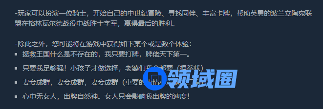 根据Steam商店介绍,《十字军骑士》由诺贝尔文学奖得主显克微支的同名历史小说《十字军骑士》改编,是一款以卡牌玩法为主的RPG角色扮演游戏(说人话就是打牌),在卡牌战斗的同时加入了伙伴技能连携系统,根据玩家打出的牌释放不同的专属技能从而构筑万千流派(三消Pro Plus Max版)。您将会在游戏中结识并招募到众多同伴(划重点,小姐姐超多),踏上一段波澜壮阔的旅程。