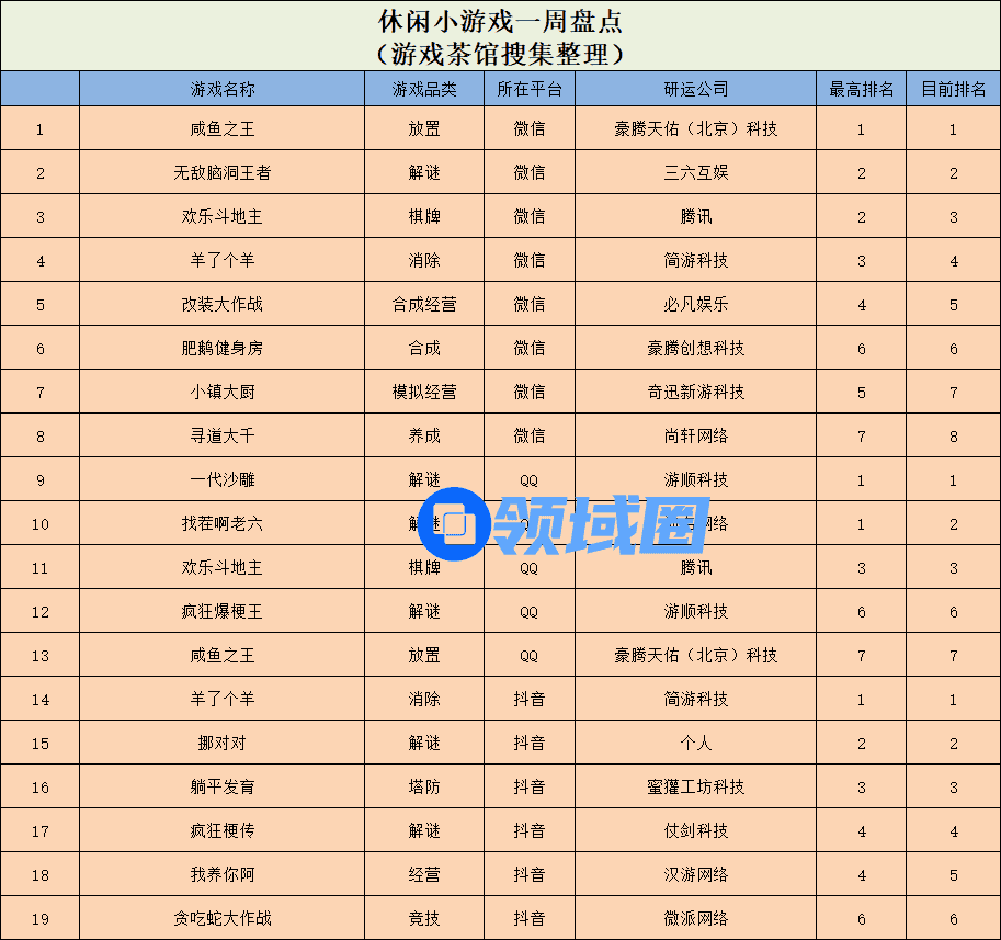 休闲新游周报每周统计微信小游戏、QQ小游戏、抖音小游戏、硬核小游戏以及App Store和Google Play上的新游爆款,并按照分类制作表格,将游戏排名情况等信息公布,希望给到行业同侪帮助。