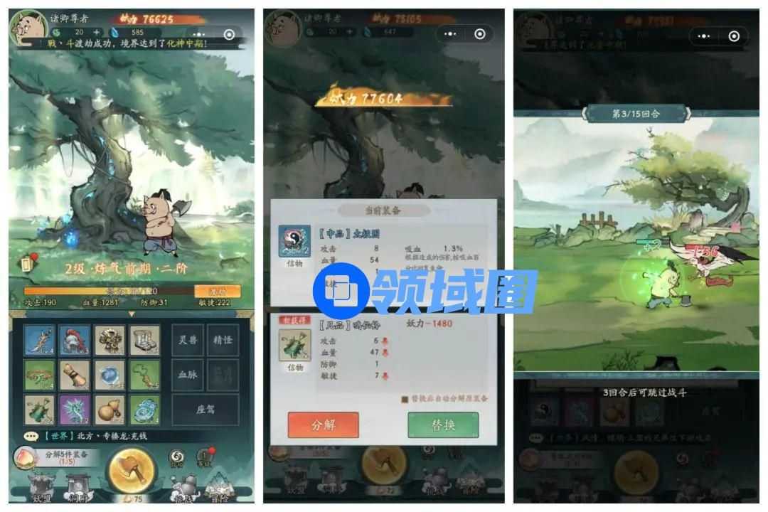 从玩法上来看,《寻道大千》是一款类似《疯狂骑士团》的“开箱子”游戏,在游戏早期阶段,玩家只需要根据任务引导,花费桃子数量砍仙树,将掉落的装备穿戴或者分解,提升角色属性,积累修为,然后进入冒险模式中打败敌人获得更多奖励。