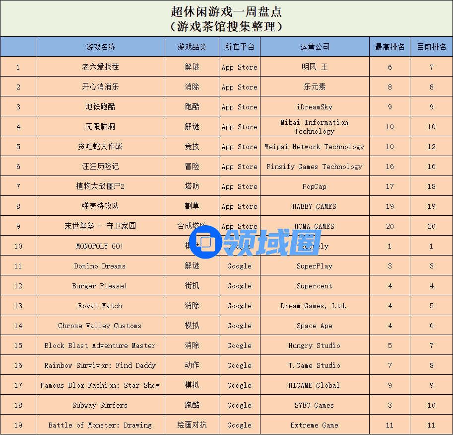 超休闲方面,在国内App Store免费游戏榜单中,解谜玩法的《老六爱找茬》稳坐超休闲榜首和App Store免费游戏榜单第7名,同时,经典休闲游戏《开心消消乐》和《地铁跑酷》则分别拿下了免费游戏榜单第8和第9名。