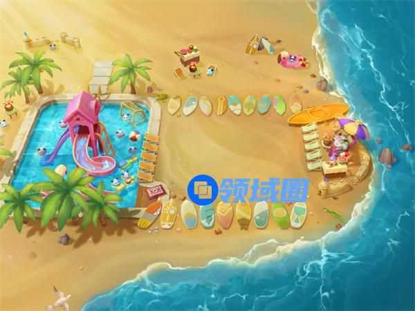 棋盘是水上乐园主题,自带海景那种,左侧有个夏日感max的水上乐园,里面有好多魄罗在玩水,金币槽改成了沙滩躺椅,吃鸡后会有水炮礼花从左侧的泳池炮台上射出,海滩场景清凉感拉满,突出的就是一个应景。