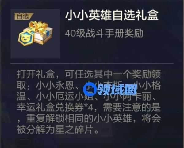 战斗手册在升到40级会给一个小小英雄自选礼盒,可以在小小永恩/小小杰斯/小小格温/小小厄运小姐/小小阿卡丽以及幸运礼盒兑换券里面五选一,都是曾经登场过的人气小小英雄返场,主要是这个东西追一下进度的话貌似要花的钱很少,不到一张月卡钱,性价比不错,有想要的可以考虑。