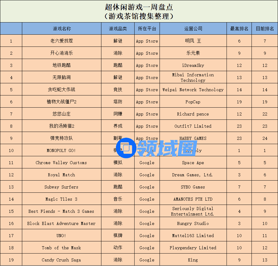 超休闲方面,在国内App Store免费游戏榜单中,解谜玩法的《老六爱找茬》冲上超休闲榜首,且其当前位于App Store免费游戏榜单第7名,同时,两款经典爆款《开心消消乐》和《地铁跑酷》紧随其后,分别拿下了免费游戏榜单第9和第12名。此外,来自Richard pence的网赚产品《悠悠山庄》也在本周冲上了榜单前列,且其当前位于免费榜单第22名。